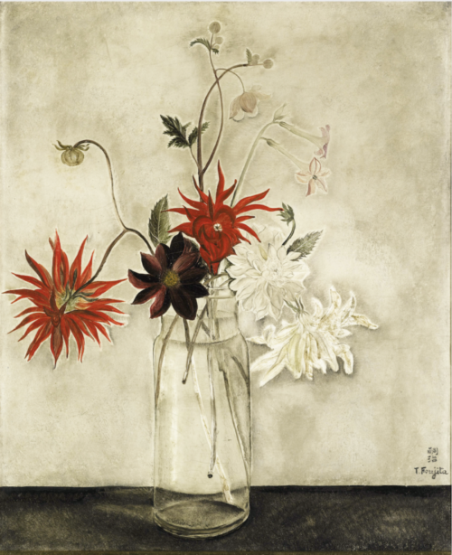 Il y a cent ans en 1921, Foujita mettait au point une technique révolutionnaire à ses yeux : enduire le fond de la toile de ses peintures à l’huile d’une épaisse pâte blanche d’aspect lisse et blanc qui lui permette de tracer sur cette surface lisse, mais aussi poreuse que du papier japonais, des lignes fines au pinceau très fin avec de la couleur noire diluée à l’huile ou à l’eau. Il put ainsi dessiner à la pointe de son pinceau des contours d’une finesse et d’une précision remarquable, notamment ceux des anatomies féminines. Mais pas seulement puisque les animaux, les enfants et les fleurs sont aussi ses thèmes de prédilection et qu’il excelle à les décrire jusque dans les moindres détails.